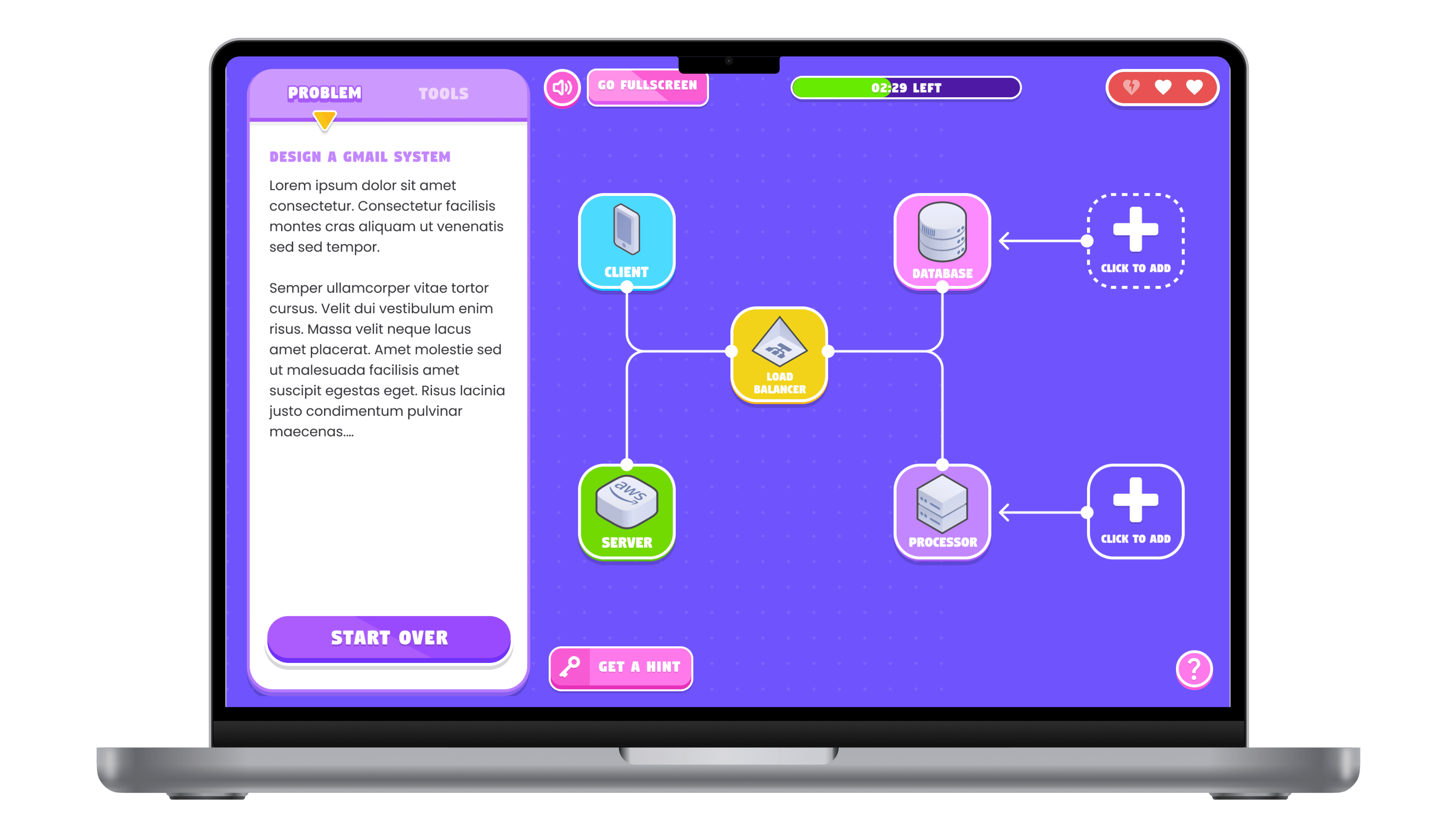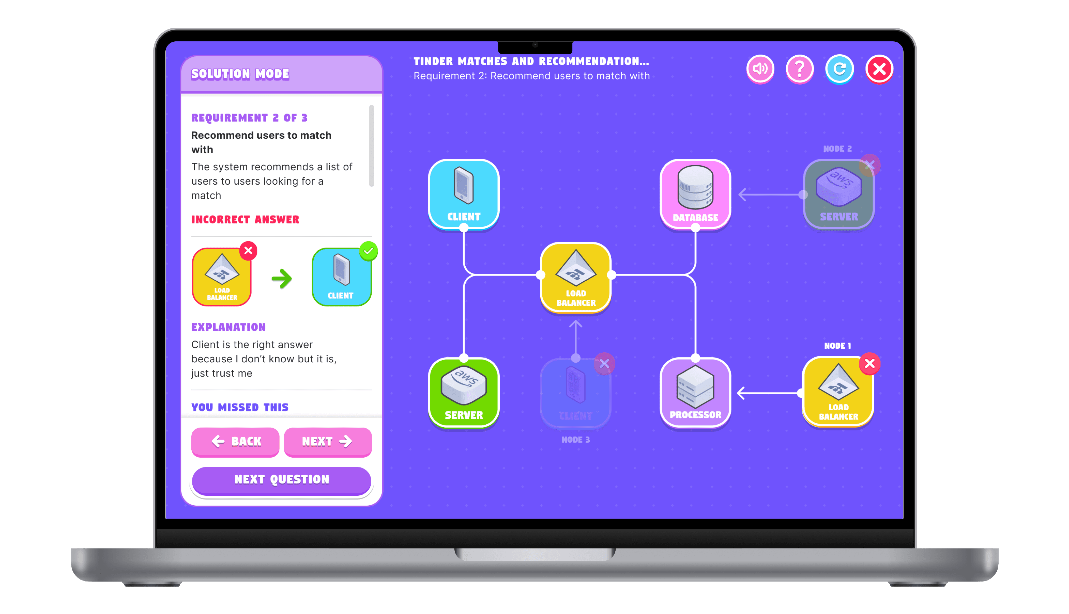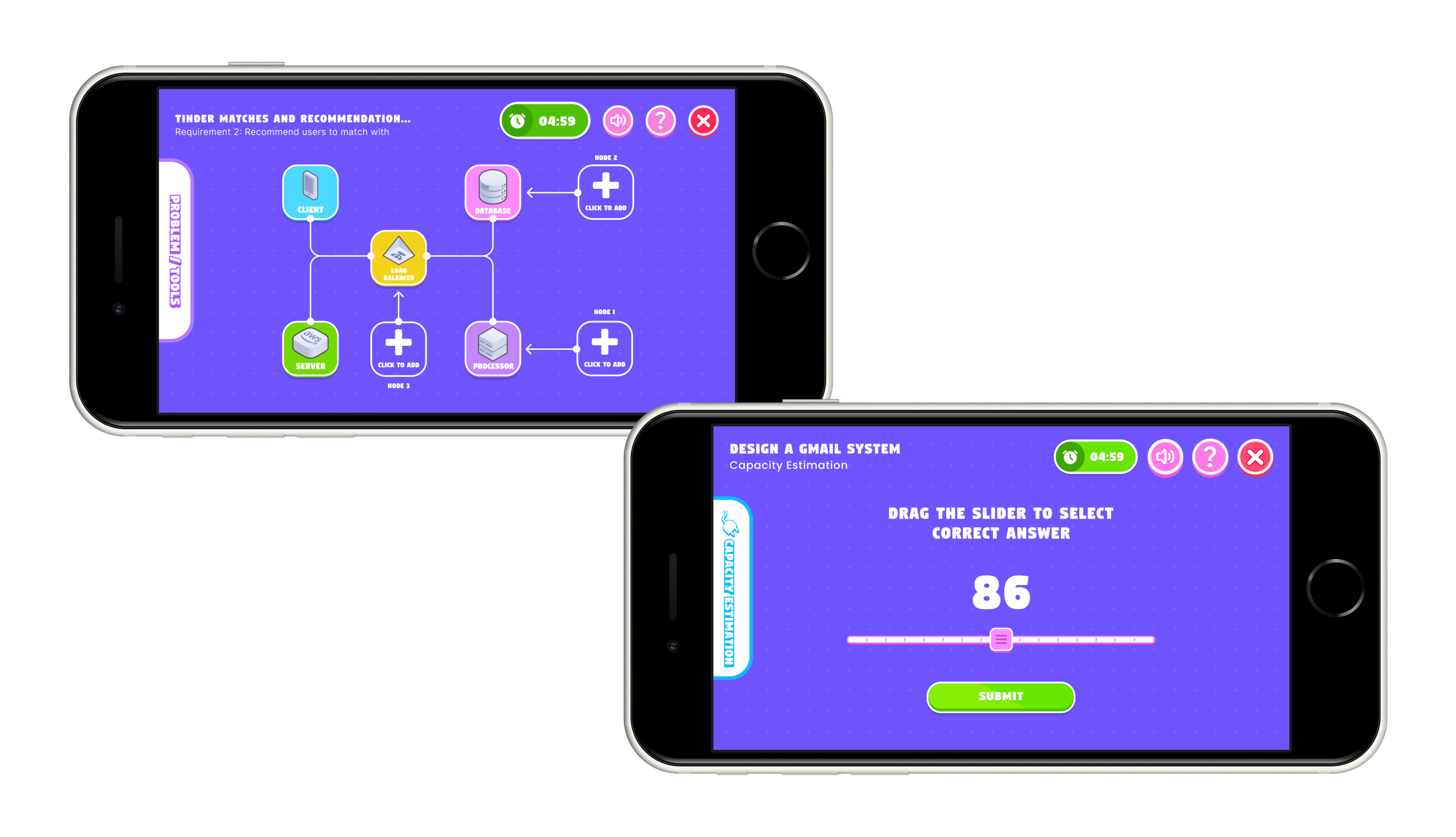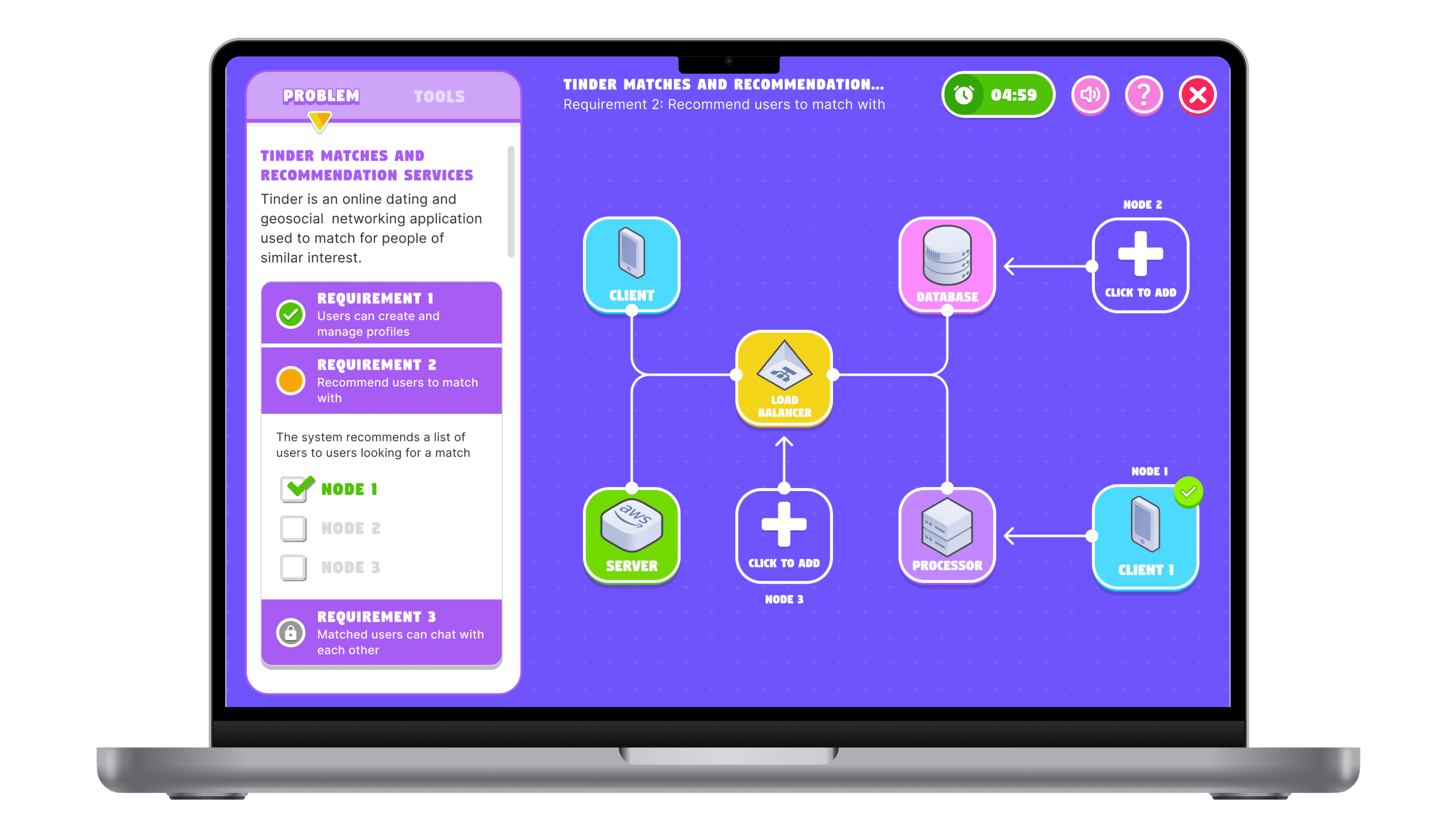 This mode challenges users to engage in multi-phase system design scenarios, where each decision impacts the overall system architecture. Users receive real-time feedback on how their choices affect the design, fostering iterative learning and decision-making skills. With progressive difficulty scaling, the challenges become increasingly complex, simulating real-world problem-solving environments. A time-based scoring system keeps users motivated and rewards efficient, effective solutions.