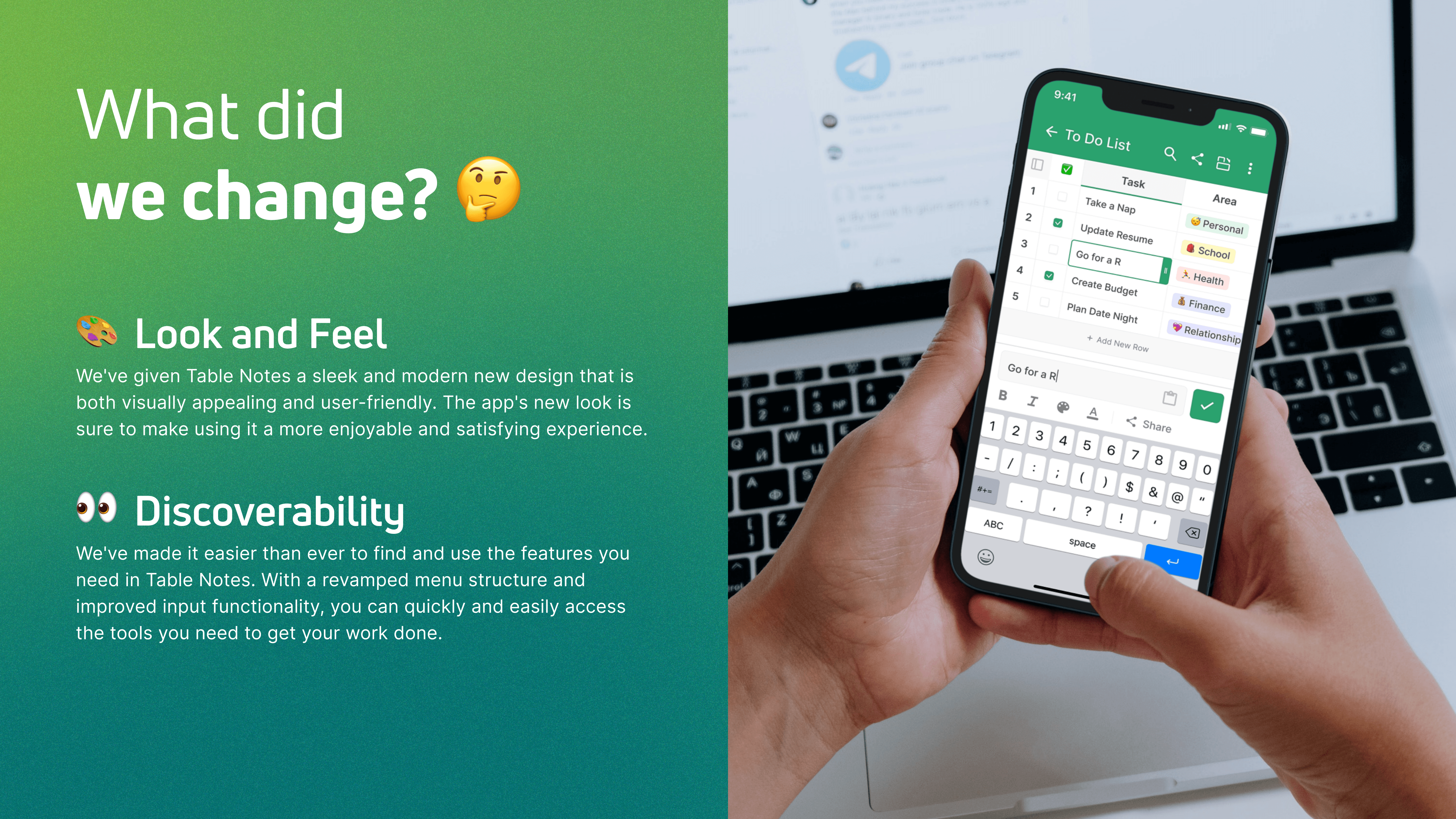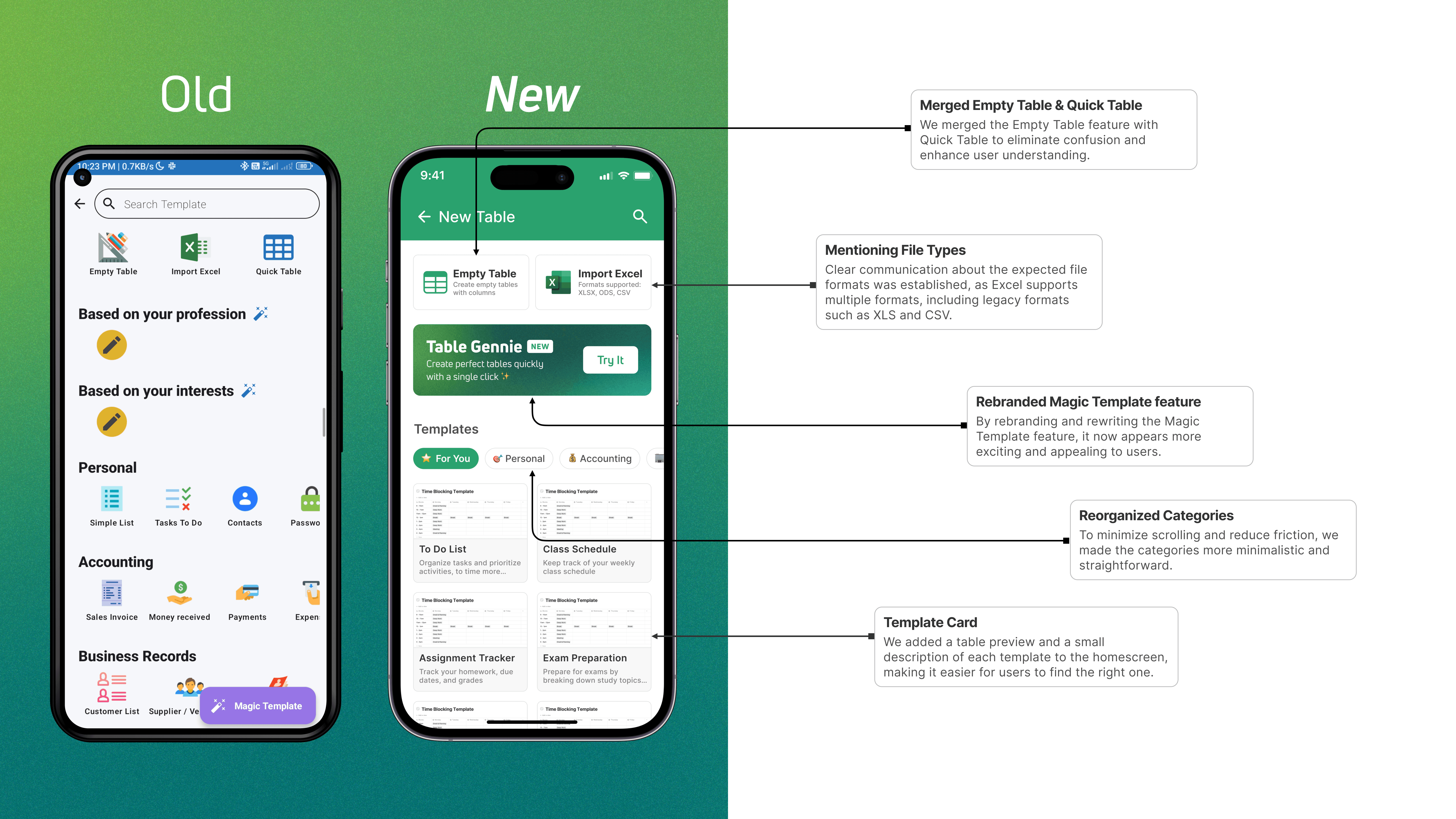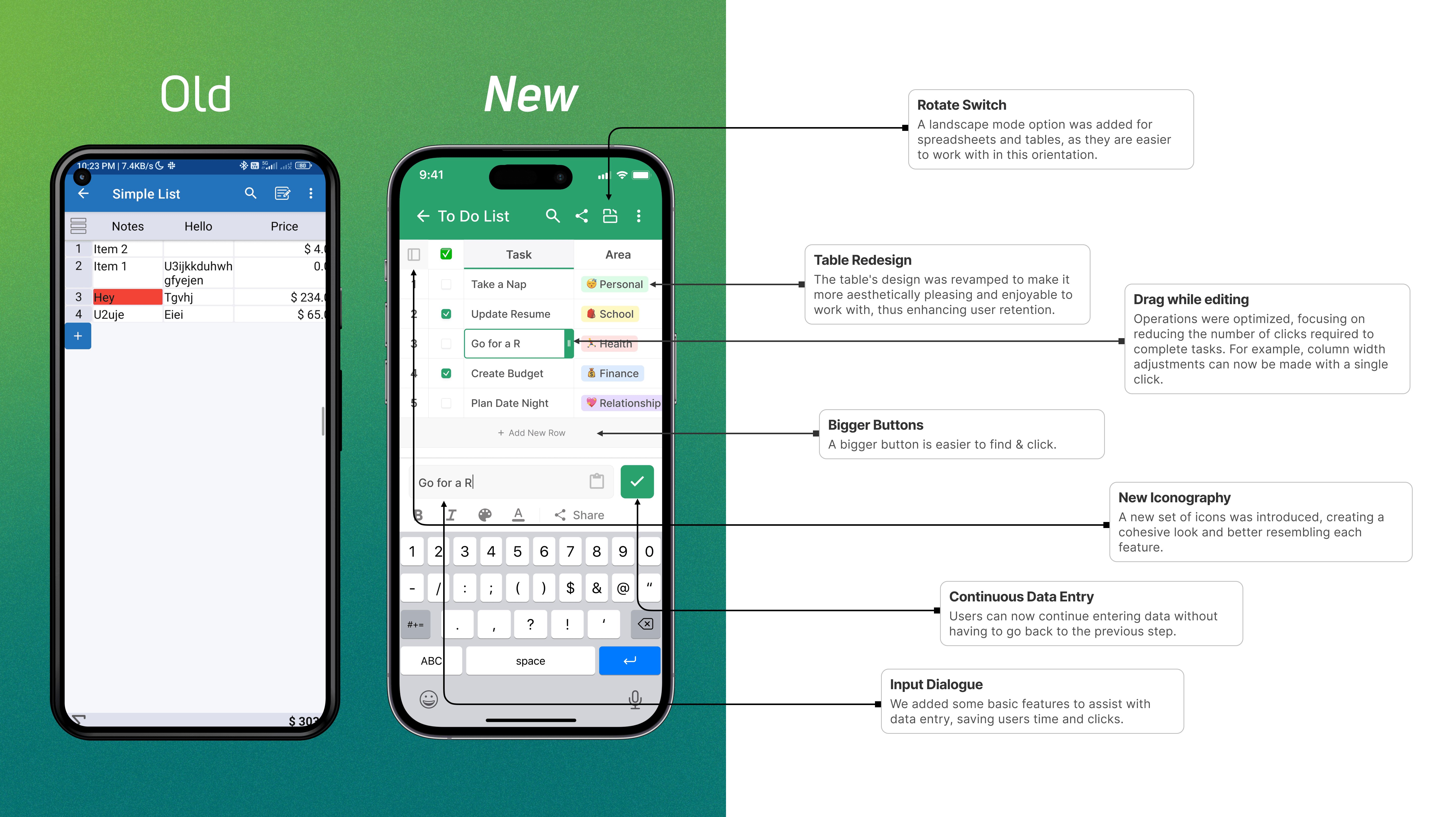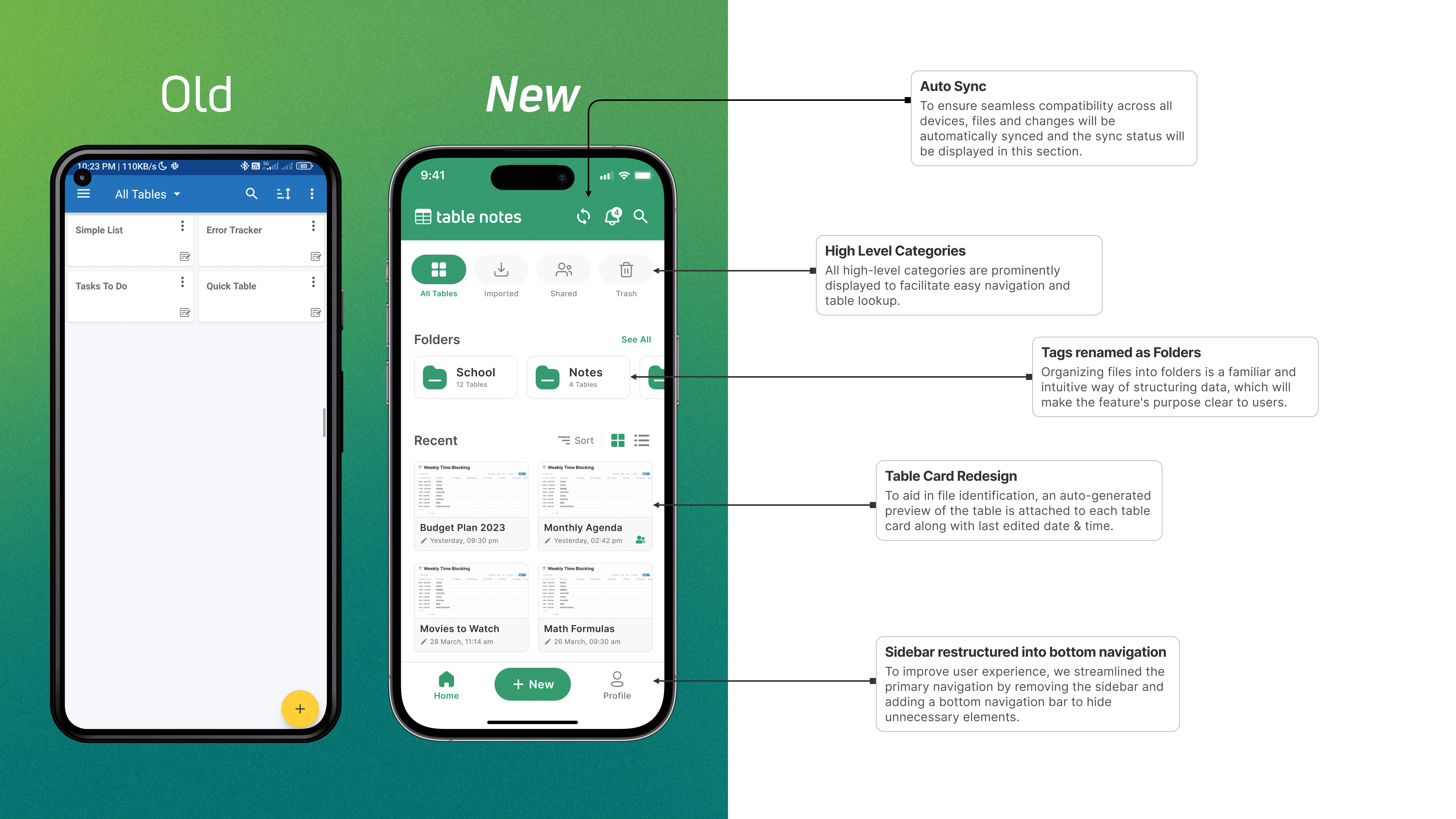 Feature Old Design New Design Navigation Sidebar navigation Bottom navigation bar Table Cards Basic design Table preview with metadata File Organization Tags Folders Table Design Simple and outdated Modern and visually appealing Data Entry Multi-step process Continuous data entry